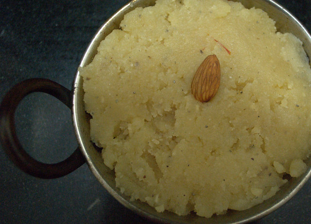When I was a kid, he would always buy badam halwa from MTR, Bangalore (MTR is famous for it's spices and ready to make packets).The halwa used to be very heavy and literally ghee used to drip from the packets. My mother would get atleast a tablespoon of ghee, each time she warmed the halwa. You could only taste ghee...and I didn't like it too much. MTR still makes the halwa and it's been ages since I've had it.